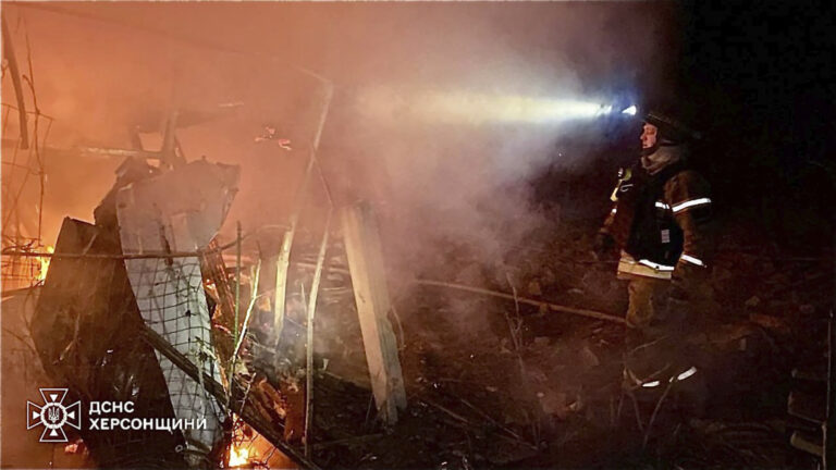 Na snímke ukrajinskej pohotovostnej služby hasiči hasia požiar súkromných domov po útoku ruských riadených leteckých bômb v Chersone na Ukrajine v sobotu 15. marca 2025. Foto: Ukrainian Emergency Service via AP