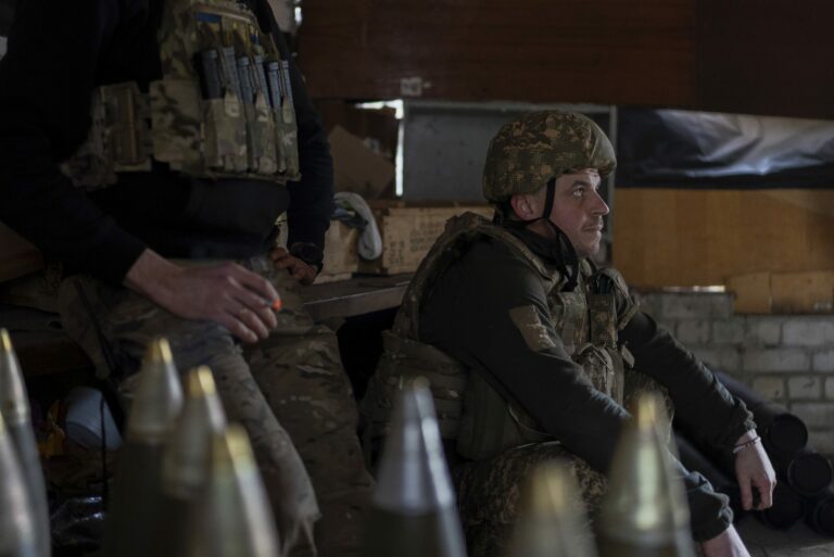 Ukrajinskí vojaci z brigády Chartia, známi pod volacími znakmi „Stalker“ (vľavo) a „Granata“ (vpravo), čakajú na rozkaz k paľbe na ruské pozície v Charkovskej oblasti na Ukrajine v stredu 12. marca 2025. Foto: SITA/AP