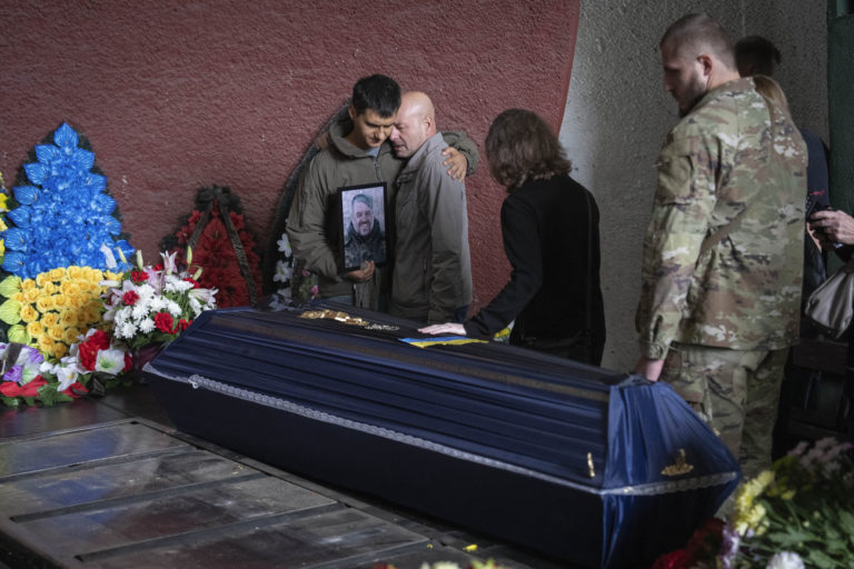Ľudia vzdávajú poslednú úctu americkému občanovi Volodymyrovi Myroniukovi, ktorý bol známy pod menom John. Fotograf z Los Angeles prišiel o život, keď fotil bitku s ruskými jednotkami. Foto: SITA/AP