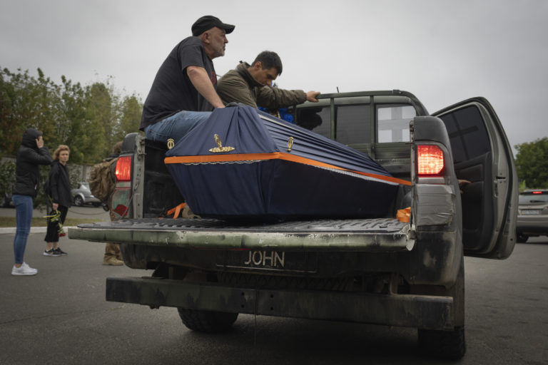 Priatelia sprevádzajú rakvu amerického občana Volodymyra Myroniuka, známeho pod menom John (59). Fotograf z Los Angeles prišiel o život, keď fotil bitku s ruskými jednotkami. Foto: SITA/AP