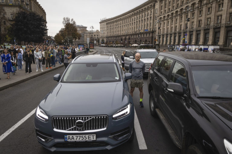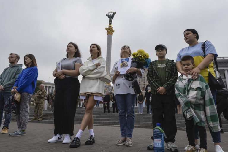 Ukrajinci stoja počas celonárodnej minúty ticha na pamiatku ukrajinských vojakov padlých vo vojne krajiny proti Rusku na Námestí nezávislosti v Kyjeve na Ukrajine v nedeľu 1. októbra 2023. Ukrajina si v nedeľu pripomína pamiatku veteránov a padlých vojakov. V rámci reforiem cirkevného kalendára, ktoré zaviedol prezident Volodymyr Zelenskyj, sa dátum každoročného Dňa obrancov posunul zo 14. októbra. Foto: SITA/AP