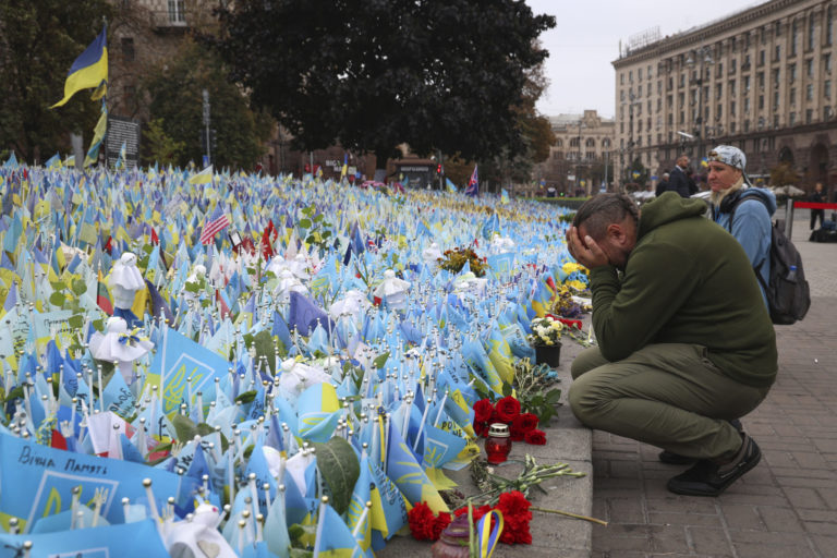 Žena plače pri pamätníku pokrytom ukrajinskými vlajkami počas celonárodnej minúty ticha za padlých vojakov. Foto: SITA/AP