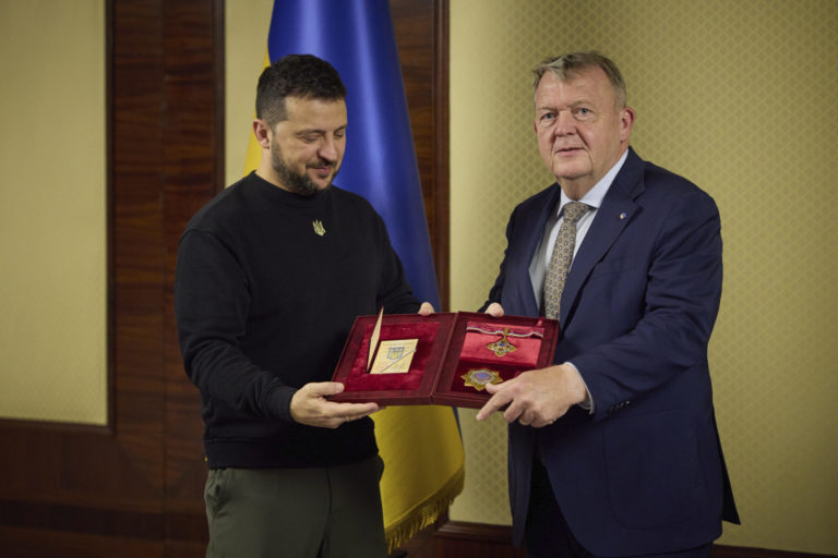 Dánsky minister zahraničných vecí Lars Lokke Rasmussen (vpravo) sa v Kyjeve stretol s ukrajinským prezidentom Volodymyrom Zelenským. Foto: SITA/Ukrainian Presidential Press Office via AP