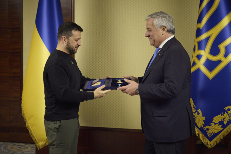 Ukrajinský prezident Volodymyr Zelenskyj vyznamenáva talianskeho ministra zahraničných vecí Antonia Tajaniho počas ich stretnutia v Kyjeve na Ukrajine. Foto: SITA/Ukrainian Presidential Press Office via AP