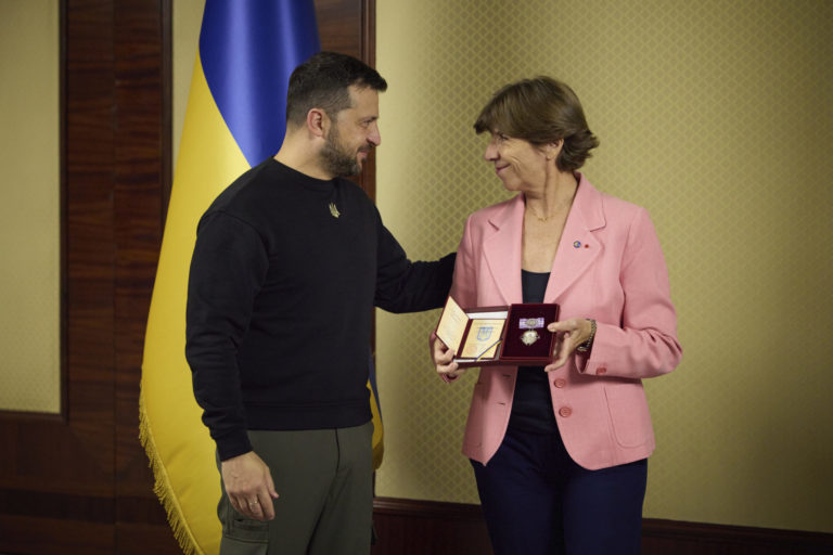 Francúzska ministerka zahraničných vecí a európskych záležitostí Catherine Colonna (vpravo) drží v rukách ukrajinské štátne vyznamenanie. V Kyjeve ho dostala na stretnutí s ukrajinským prezidentom Volodymyrom Zelenským. Foto: SITA/Ukrainian Presidential Press Office via AP