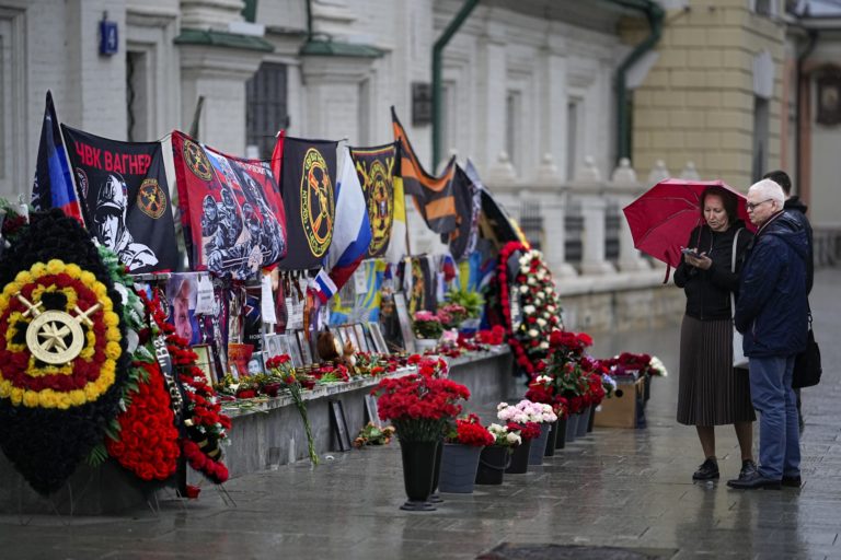 Dvojica stojí neďaleko Kremľa pri improvizovanom pamätníku šéfa žoldnierskej skupiny Wagnerovci Jevgenija Prigožina a ďalších, ktorí spolu s ním zahynuli pri havárii lietadla. Foto: SITA/AP