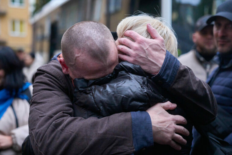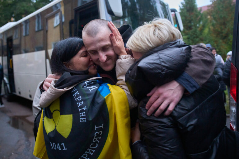 Vojak, ktorý sa vrátil z ruského zajatia, objíma svojich príbuzných počas výmeny vojnových zajatcov medzi Ruskom a Ukrajinou v Černihivskej oblasti na Ukrajine, štvrtok, 2. októbra 2025. Foto: SITA/AP