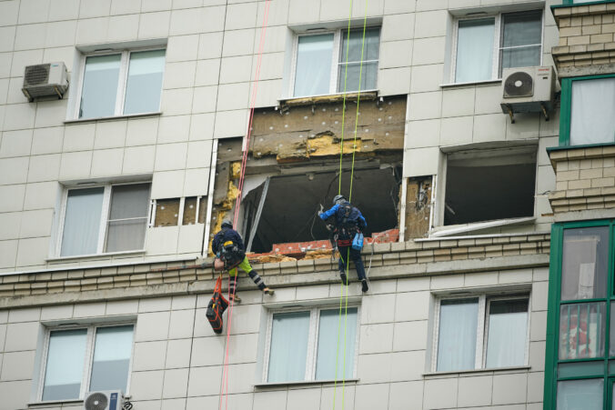 Zamestnanci mestskej časti pracujú pri poškodenom viacposchodovom bytovom dome, ktorý v piatok 24. októbra 2025 zasiahol ukrajinský dron v Krasnogorsku neďaleko Moskvy v Rusku. Foto: SITA/AP