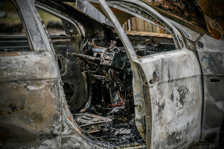 Zhorené auto po ruskom útoku vo štvrtok 23. októbra 2025 v kyjevskej štvrti Podil na Ukrajine. Foto: SITA/AP