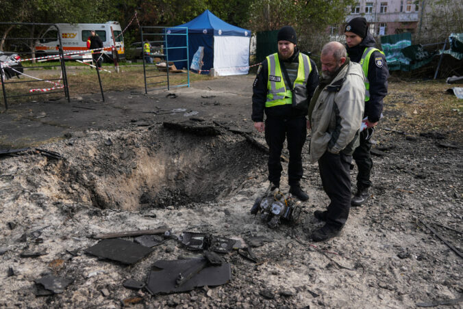 Policajti skúmajú motor a kráter dronu po ruskom útoku vo štvrtok 23. októbra 2025 v kyjevskej štvrti Podil na Ukrajine. Foto: SITA/AP
