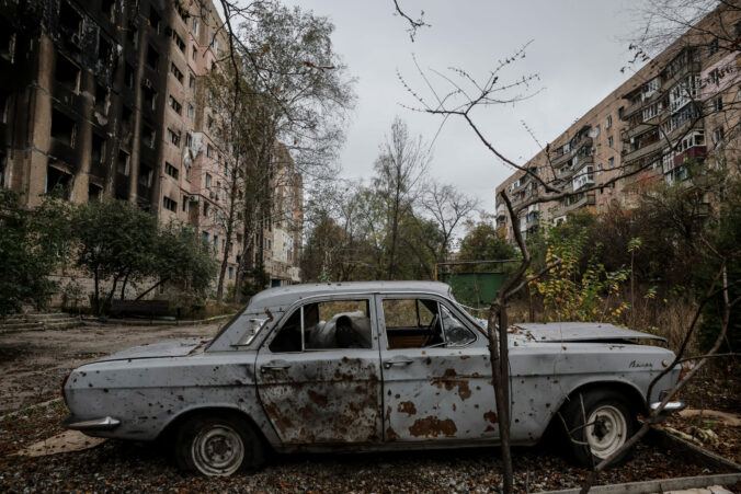 Na tejto fotografii, ktorá bola zhotovená 13. októbra 2025 a poskytnutá tlačovou službou 24. mechanizovanej brigády Ukrajiny, je vidieť poškodené súkromné auto v meste Kostiantynivka, ktoré sa nachádza na fronte, kde stále žije približne 5000 ľudí bez dodávok vody, elektriny a plynu, v mieste najtvrdších bojov s ruskými jednotkami v Doneckej oblasti na Ukrajine. Foto: Oleg Petrasiuk/Ukraine's 24th Mechanized Brigade via AP