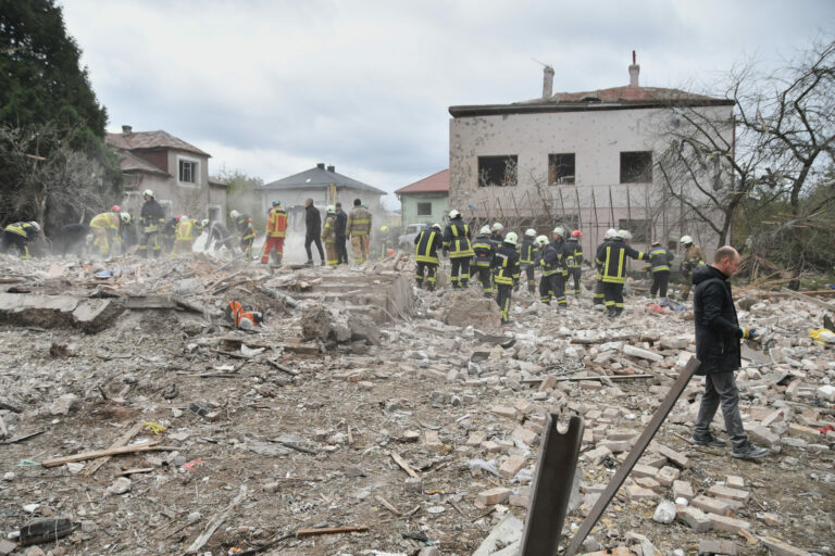 Záchranári hľadajú obete v troskách zničeného domu po ruskom raketovom útoku na okraji Ľvova na Ukrajine v nedeľu 5. októbra 2025. Foto: SITA/AP