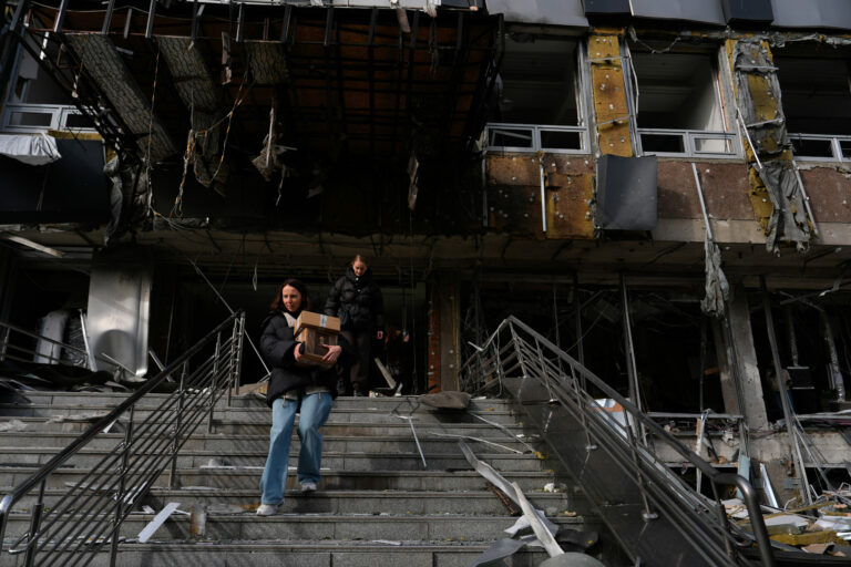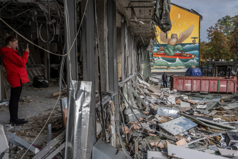 Žena vynáša krabice z obchodného centra Domino Business Center po tom, čo bolo poškodené pri ruskom útoku vo štvrtok 23. októbra 2025 v štvrti Podil v Kyjeve na Ukrajine. Foto: SITA/AP