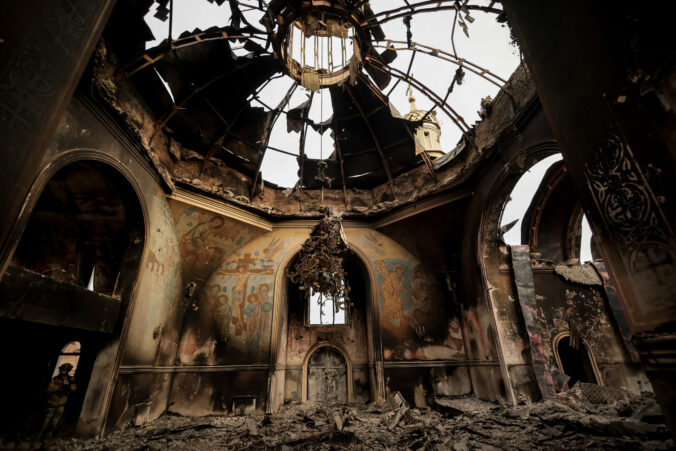 Na tejto fotografii, ktorá bola zhotovená 13. októbra 2025 a poskytnutá tlačovou službou 24. mechanizovanej brigády Ukrajiny, ukrajinský vojak hľadí na trosky z vnútorných priestorov poškodeného kostola v meste Kostiantynivka, ktoré sa nachádza na fronte, kde stále žije približne 5000 ľudí bez dodávok vody, elektriny a plynu, v mieste najtvrdších bojov s ruskými jednotkami v Doneckej oblasti na Ukrajine. Foto: Oleg Petrasiuk/Ukraine's 24th Mechanized Brigade via AP