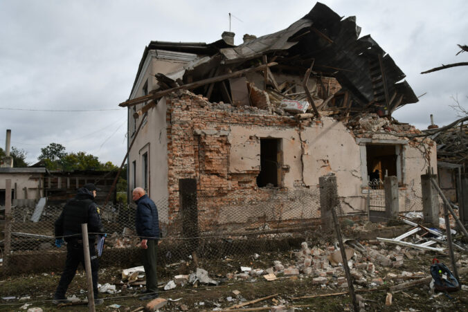 Záchranár a civilista kontrolujú trosky zničeného domu po ruskom raketovom útoku na okraji Ľvova na Ukrajine v nedeľu 5. októbra 2025. Foto: SITA/AP