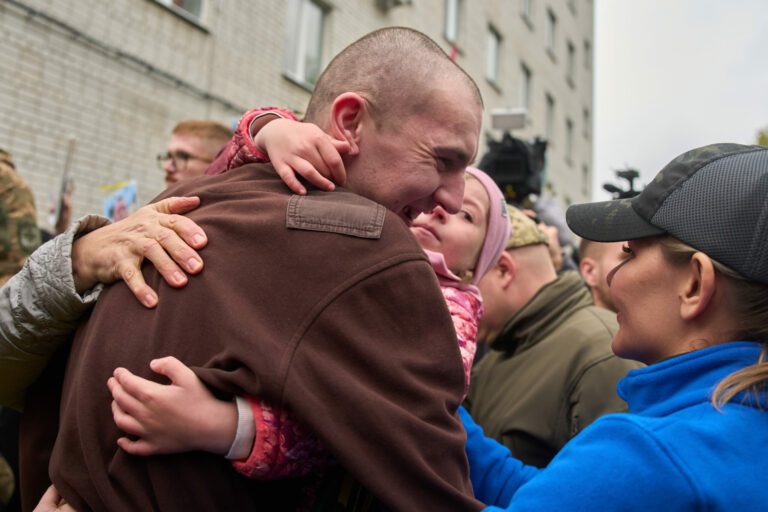 Vojak, ktorý sa vrátil z ruského zajatia, objíma svoje dieťa počas výmeny vojnových zajatcov medzi Ruskom a Ukrajinou v oblasti Černihiv na Ukrajine, štvrtok, 2. október 2025. Foto: SITA/AP