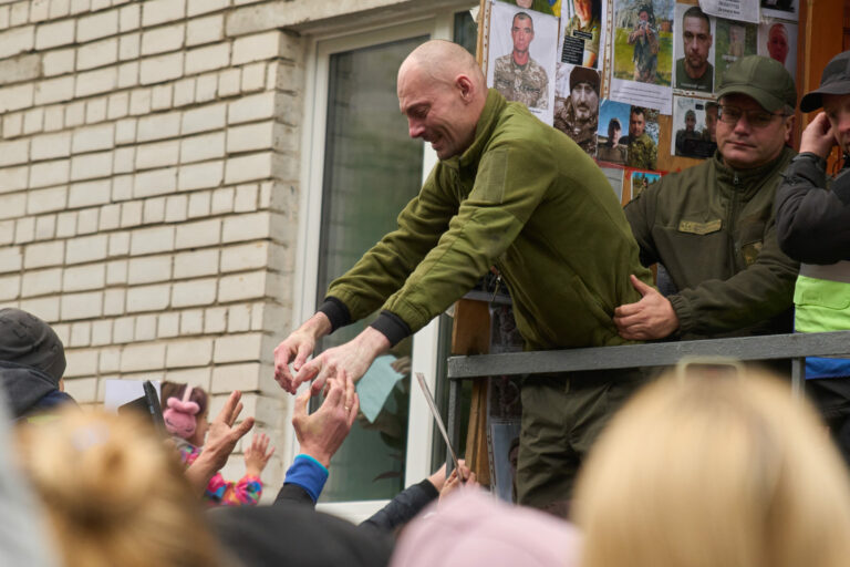 Vojak, ktorý sa vrátil z ruského zajatia, podáva ruky svojim príbuzným počas výmeny vojnových zajatcov medzi Ruskom a Ukrajinou v Černihivskej oblasti na Ukrajine, štvrtok, 2. október 2025. Foto: SITA/AP