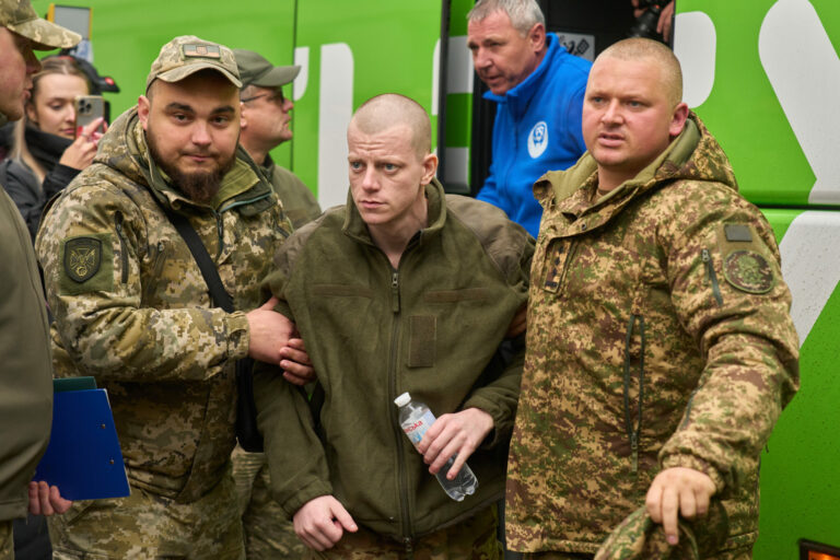 Ukrajinskí vojaci, ktorí sa vrátili z ruského zajatia, vystupujú z autobusu počas výmeny vojnových zajatcov medzi Ruskom a Ukrajinou v oblasti Černihiv na Ukrajine, štvrtok, 2. október 2025. Foto: SITA/AP