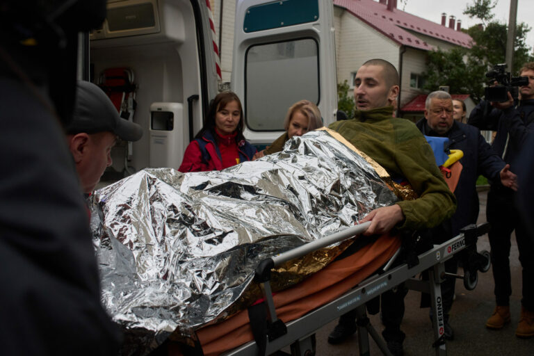 Vojenskí príslušníci pomáhajú vojakovi, ktorý sa vrátil z ruského zajatia, počas výmeny vojnových zajatcov medzi Ruskom a Ukrajinou v Černihivskej oblasti na Ukrajine, štvrtok, 2. október 2025. Foto: SITA/AP