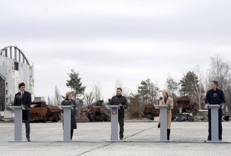 Zľava: Kanadský premiér Justin Trudeau, talianska premiérka Giorgia Meloniová, ukrajinský prezident Volodymyr Zelenskyj, predsedníčka Európskej komisie Ursula von der Leyenová a belgický premiér Alexander De Croo počas ceremónie na letisku Hostomeľ v Kyjeve pri príležitosti druhého výročia vojny. Foto: Nathan Denette/The Canadian Press via AP
