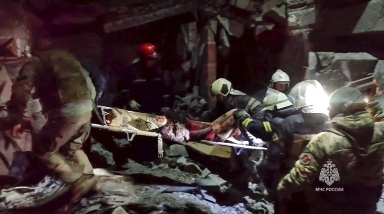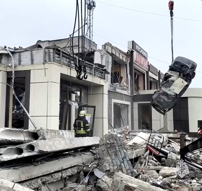 Po zásahu pekárne v meste Lysyčansk podľa oblastných ruských úradov zomrelo 18 mužov, deväť žien a jedno dieťa. Rusko tiež zverejnilo zábery takmer úplne zničenej budovy. Foto: SITA/Russian Emergency Ministry Press Service via AP