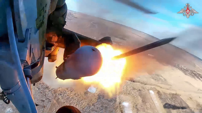 Bojový vrtuľník Mi-28N „Night Hunter“ ruského letectva strieľa rakety na cieľ na neznámom mieste na Ukrajine. Foto: SITA/Russian Defense Ministry Press Service via AP