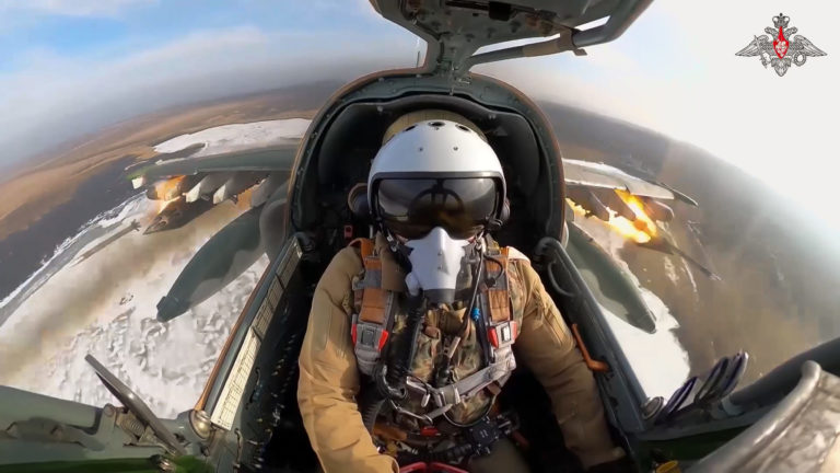 Stíhačka Su-25 ruského letectva vystreľuje rakety počas misie nad Ukrajinou. Foto: Russian Defense Ministry Press Service via AP.