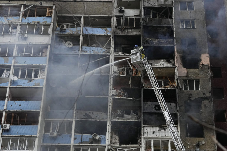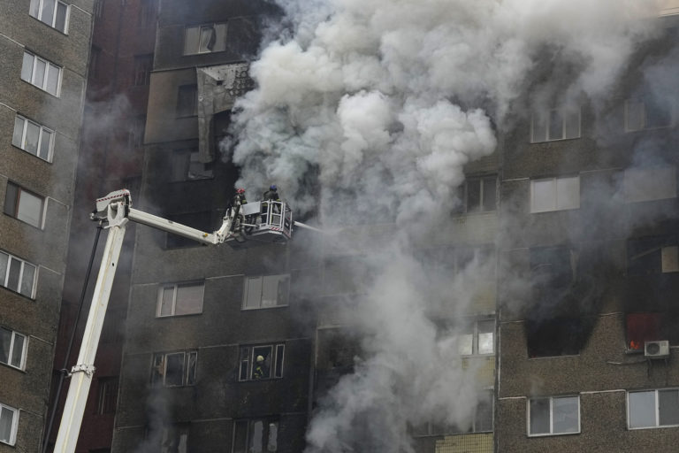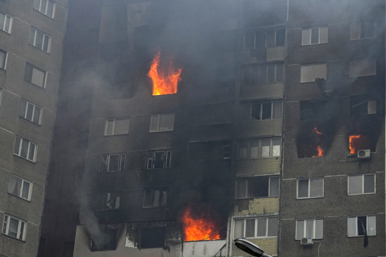 Po ruskom raketovom útoku horí v Kyjeve obytný dom. Foto: SITA/AP