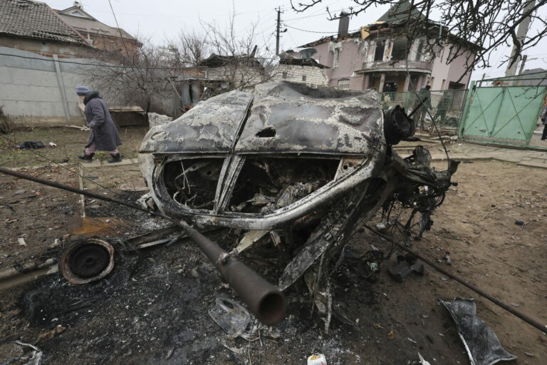 Miestna žena kráča pred autom zničeným ruským úderom na obytnú štvrť v Záporoží na Ukrajine, 1. februára 2025. Foto: SITA/AP