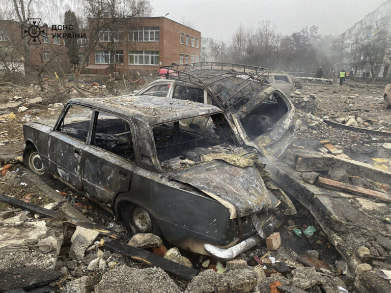 Na tejto fotografii, ktorú poskytla ukrajinská pohotovostná služba, sú poškodené autá v blízkosti zničeného bytového domu po ruskom raketovom útoku v Poltave na Ukrajine v sobotu 1. februára 2025. Foto: SITA/AP