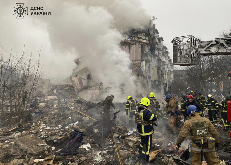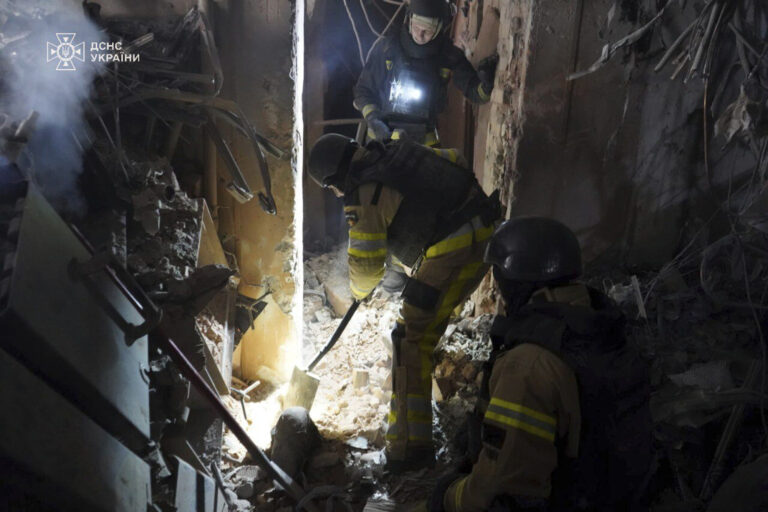 Na tejto fotografii, ktorú poskytla ukrajinská pohotovostná služba, hasiči odstraňujú trosky a hľadajú obete v zničenom bytovom dome po ruskom raketovom útoku v Poltave na Ukrajine, v sobotu 1. februára 2025. Foto: Ukrainian Emergency Service via AP.