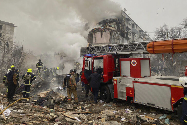 Na tejto fotografii, ktorú poskytla ukrajinská pohotovostná služba, hasiči hasia požiar v zničenom bytovom dome po ruskom raketovom útoku v Poltave na Ukrajine v sobotu 1. februára 2025. Foto: SITA/AP