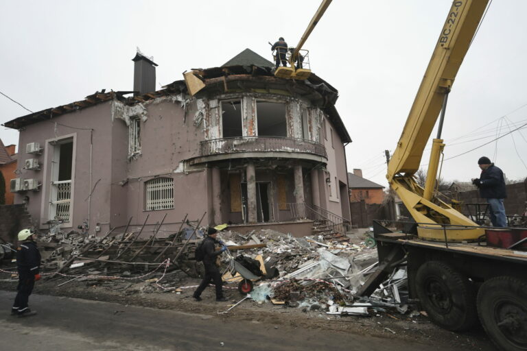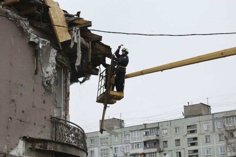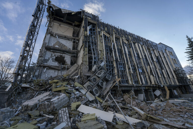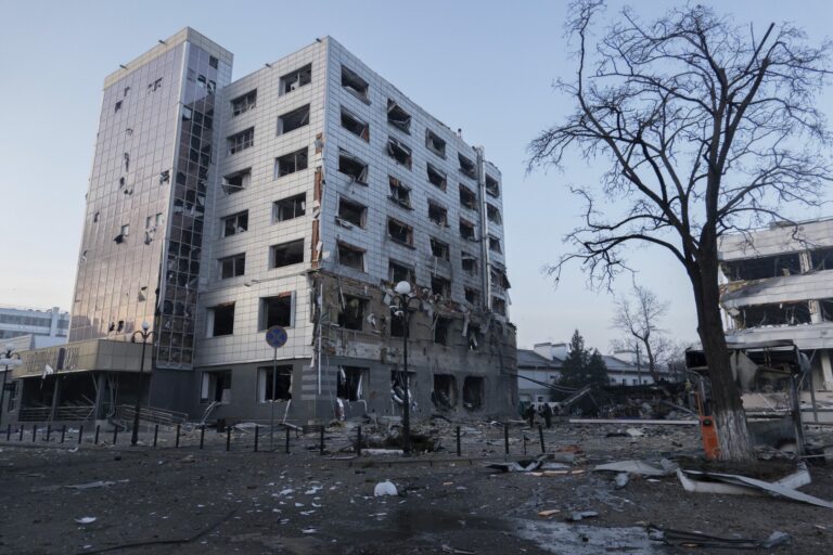 Na snímke zničená administratívna budova po ruskom útoku, pri ktorom bolo zranených viacero ľudí v Kyjeve, Ukrajina, v stredu 12. februára 2025. Foto: SITA/AP