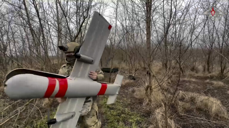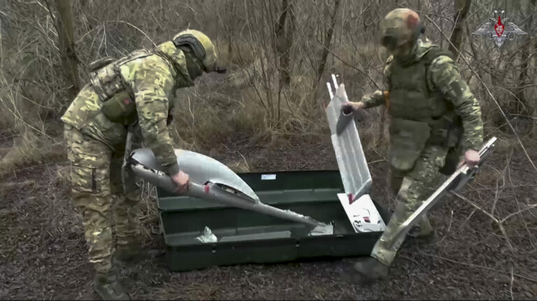 Na snímke z videa, ktoré v utorok 4. februára 2025 zverejnila tlačová služba ruského ministerstva obrany, ruskí vojaci pripravujú úderné bezpilotné lietadlo FPV „Molnija-2“ na let smerom k ukrajinskej pozícii na neznámom mieste. Foto: Russian Defense Ministry Press Service via AP
