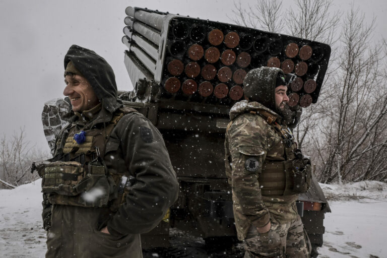 Na snímke, ktorú poskytla tlačová služba 24. ukrajinskej mechanizovanej brigády, ukrajinskí vojaci sa pripravujú na streľbu zo strely MRLS BM-21 „Grad“ na pozície ruskej armády pri Chasiv Jare v Doneckej oblasti na Ukrajine v sobotu 15. februára 2025. Foto: Oleg Petrasiuk/Ukraine's 24th Mechanised Brigade via AP