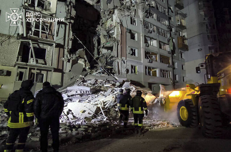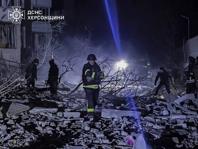 Ruiny budovy zasiahnutej ruským útokom v ukrajinskom meste Cherson. Foto: Ukrainian Emergency Service via AP