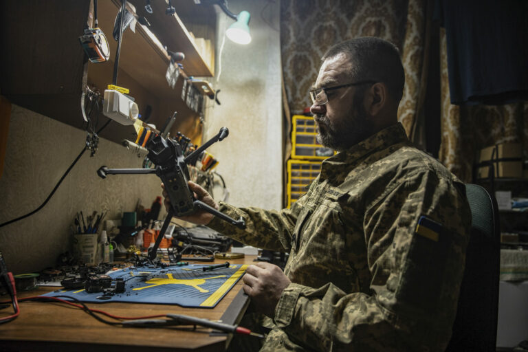 Ukrajinský vojak opravuje dron FPV v dielni na opravu dronov neďaleko frontovej línie pri Siversku v Doneckej oblasti na Ukrajine vo štvrtok 6. februára 2025. Foto: SITA/AP