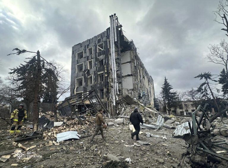 Na snímke, ktorú poskytla ukrajinská záchranná služba v utorok 4. februára 2025, záchranári kráčajú pred budovou, ktorá bola silne poškodená ruským útokom v meste Izium na Ukrajine. Foto: Ukrainian Emergency Service via AP