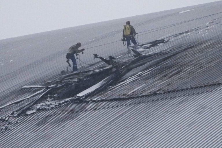 Pohľad na ochrannú nádobu, ktorá chráni zvyšky reaktora číslo štyri v bývalej jadrovej elektrárni Černobyľ a je postavená na zadržanie radiácie, po útoku dronu v Černobyle na Ukrajine v piatok 14. februára 2025. Foto: SITA/AP
