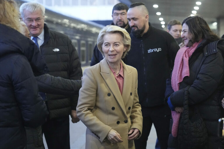 Predsedníčka Európskej komisie Ursula von der Leyenová prichádza na 3. výročie ruskej invázie na Ukrajinu do Kyjeva. Pondelok, 24. február, 2025. Foto: SITA/AP