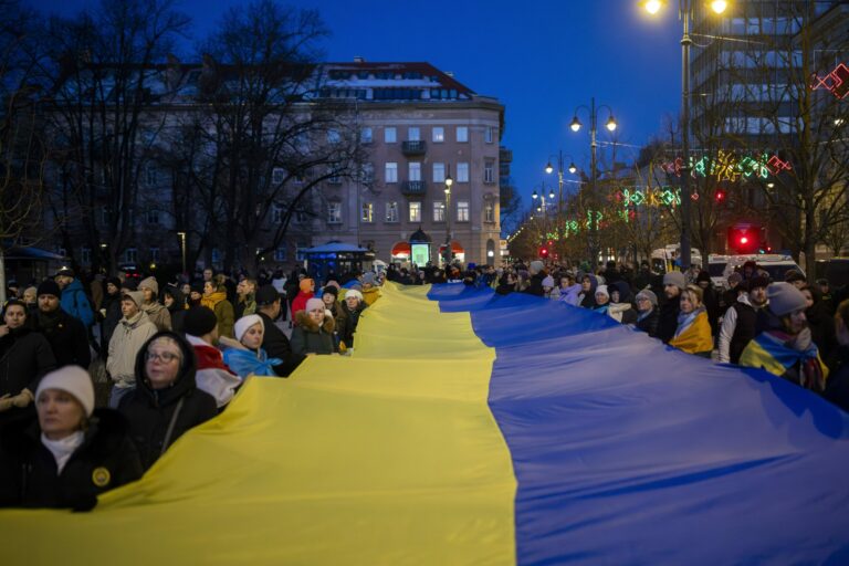 Ľudia nesú obrovskú vlajku Ukrajiny pri príležitosti 3. výročia ruskej invázie na Ukrajinu vo Vilniuse v Litve. Nedeľa, 23. február, 2025. Foto: SITA/AP