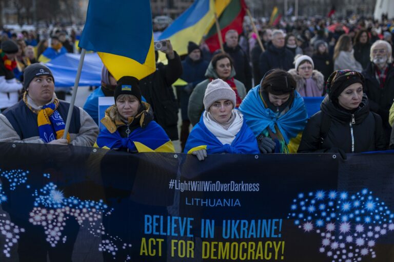 Ľudia na demonštrácii pri príležitosti 3. výročia ruskej invázie na Ukrajinu vo Vilniuse v Litve. Nedeľa, 23. február, 2025. Foto: SITA/AP