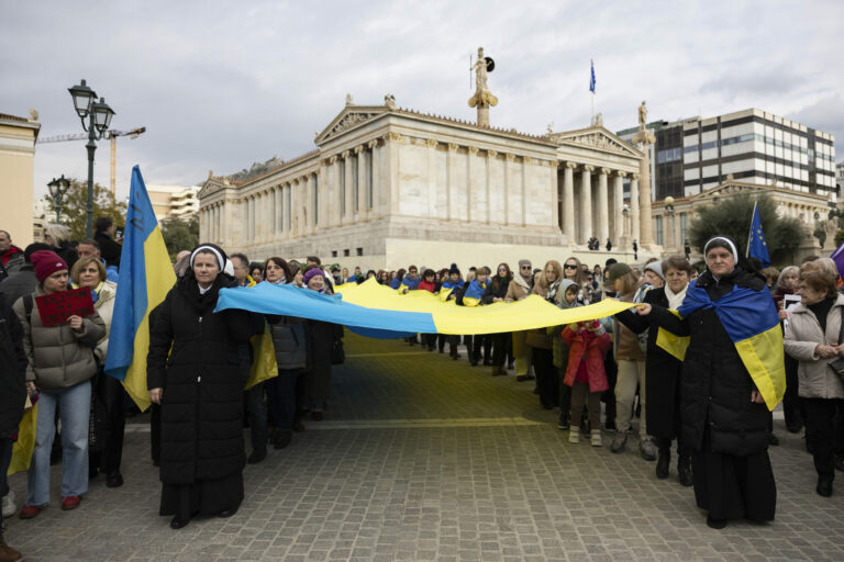Protestujúci nesú ukrajinskú vlajku pri príležitosti 3. výročia ruskej invázie na Ukrajinu v Aténach v Grécku. Nedeľa, 23. február, 2025. Foto: SITA/AP