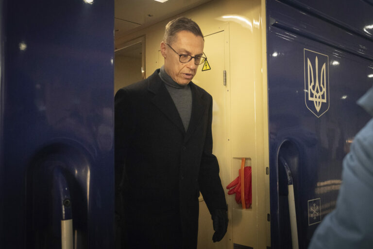 Fínsky prezident Alexander Stubb prichádza do Kyjeva na 3. výročie ruskej invázie na Ukrajinu. Pondelok, 24. február, 2025. Foto: SITA/AP