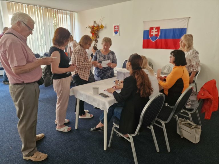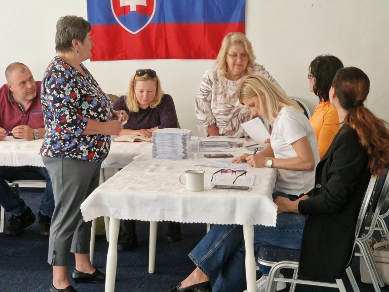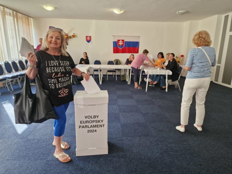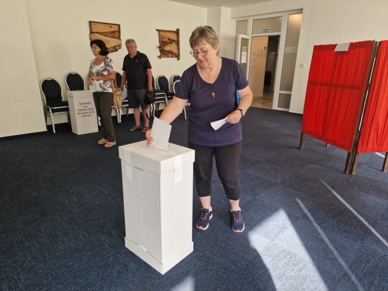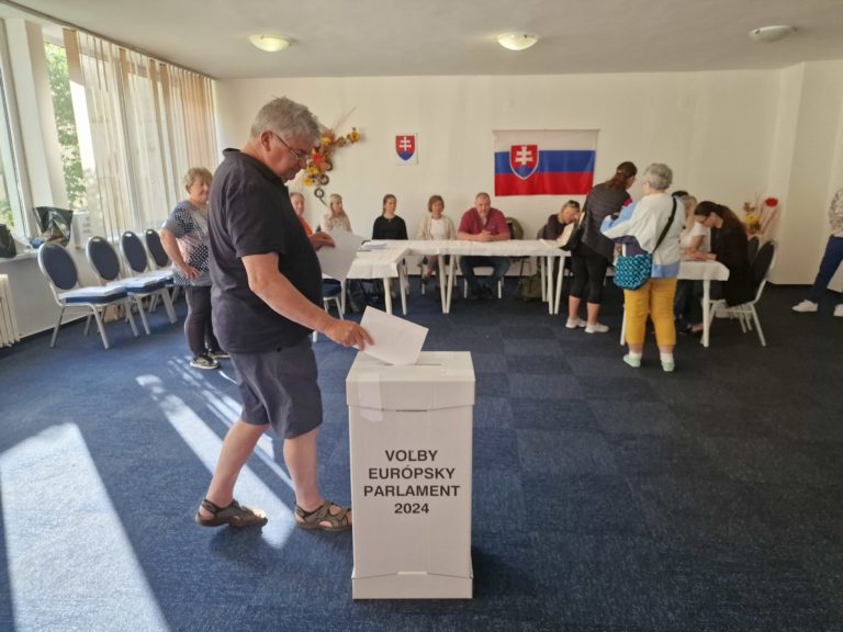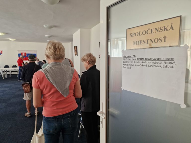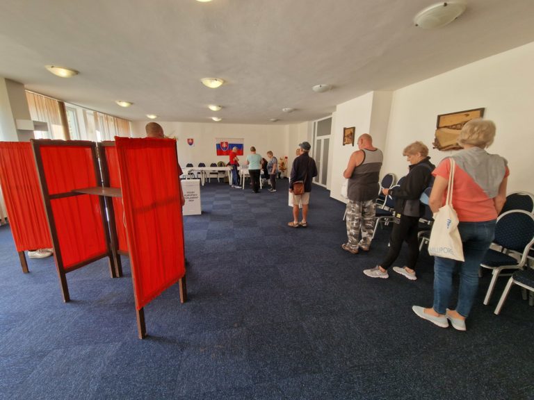 Priebeh volieb vo volebnej miestnosti nachádzajúcej sa v hoteli Ozón v Bardejovských Kúpeľoch počas volieb do Európskeho parlamentu 2024 na Slovensku. Bardejovské Kúpele, 8. jún 2024. Foto: SITA/Ivan Kriššák.