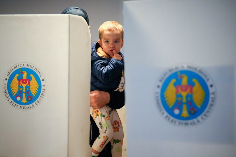 A child peers out a voting booth as a man casts his vote during a parliamentary election, in Chisinau, Moldova, Sunday, Sept. 28, 2025. (AP Photo/Vadim Ghirda) Foto: SITA/AP