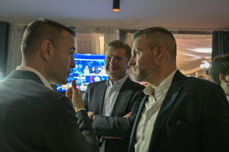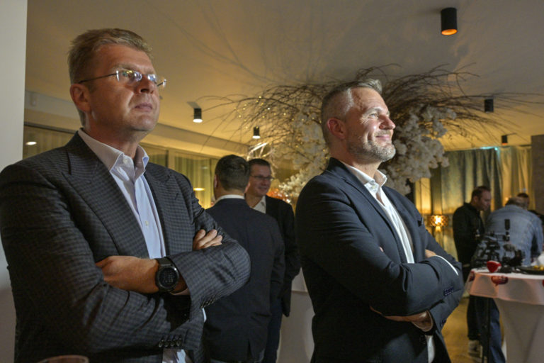 Predseda strany HLAS-SD Peter Pellegrini (vľavo) počas volebnej noci strany HLAS - sociálna demokracia (HLAS-SD) v Aušpic restaurant & lounge v rámci predčasných volieb do Národnej rady SR 2023. Bratislava, 30. september 2023. Foto: Foto: SITA/Milan Illík