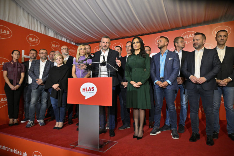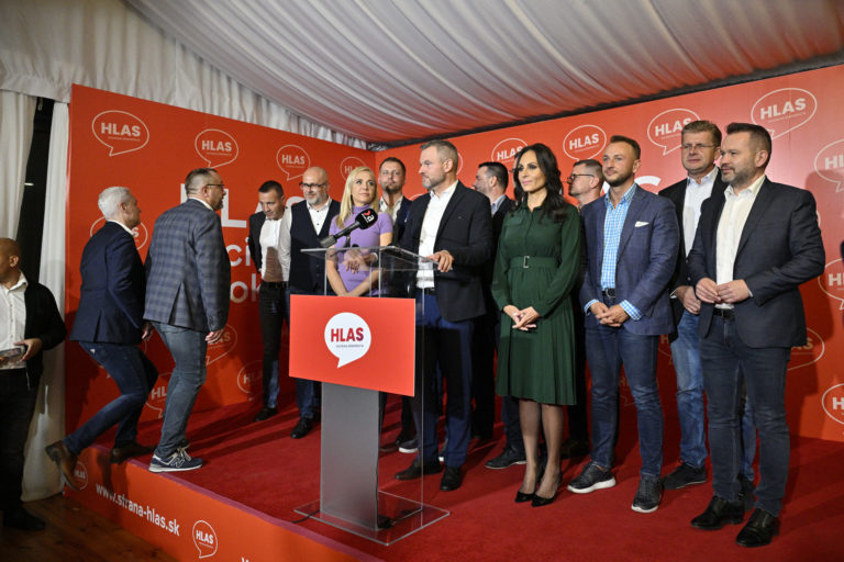 Sprava: Podpredsedníčka strany HLAS-SD Zuzana Dolinková, predseda strany HLAS-SD Peter Pellegrini a podpredsedníčka strany HLAS-SD Denisa Saková počas volebnej noci strany HLAS - sociálna demokracia (HLAS-SD) po ukončení predčasných volieb do Národnej rady SR 2023. Bratislava, 1. október 2023. Foto: SITA/Milan Illík