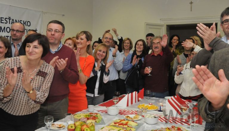 Kandidát na primátora Trnavy Peter Bročka (tretí sprava) počas čakania na oficiálne výsledky komunálnych volieb 2014. Trnava, 15. november 2014. Foto: SITA/Ivan Kopčáni