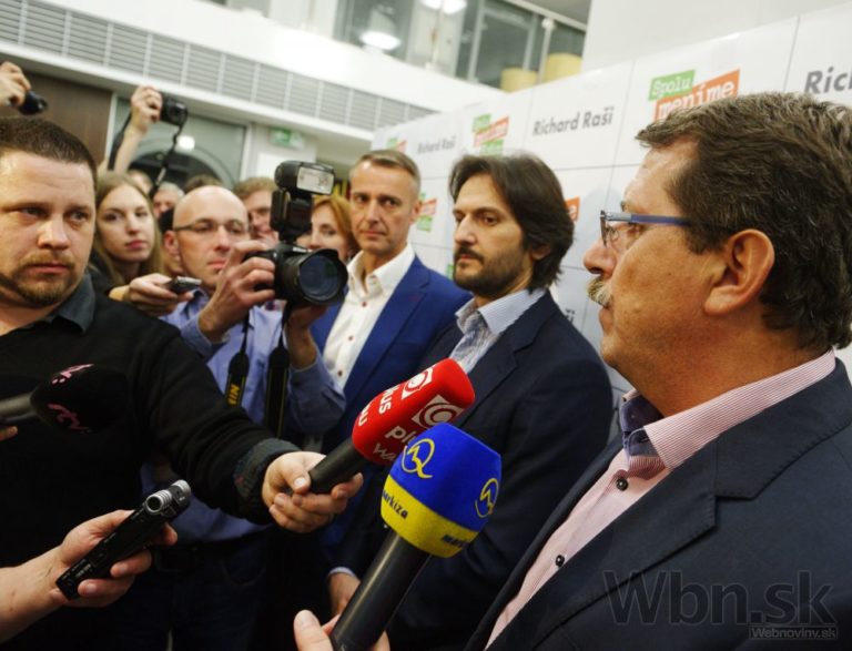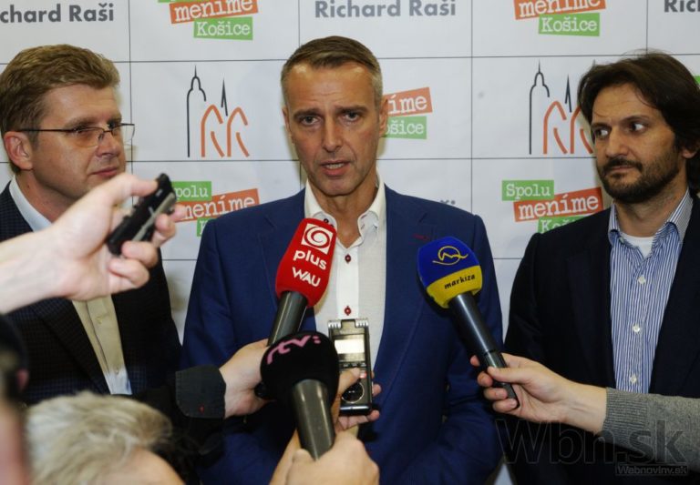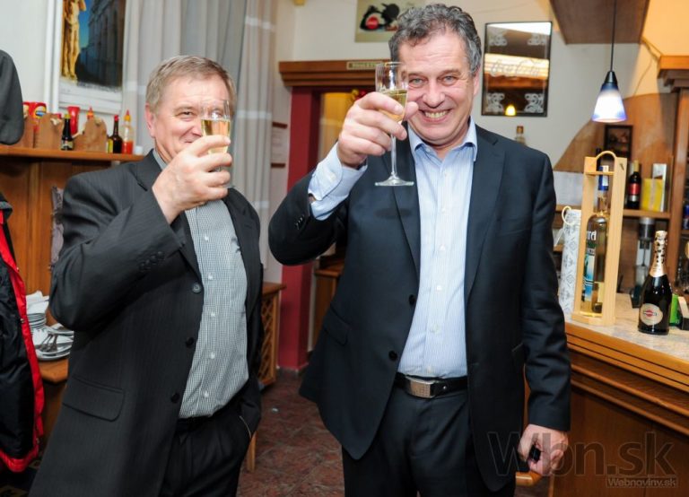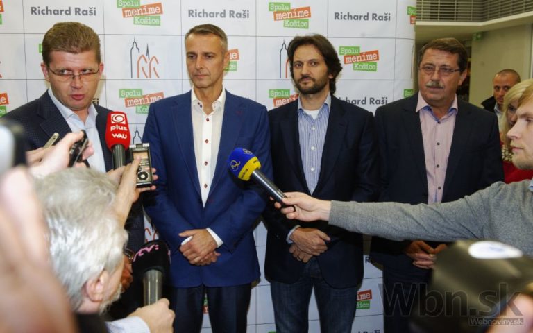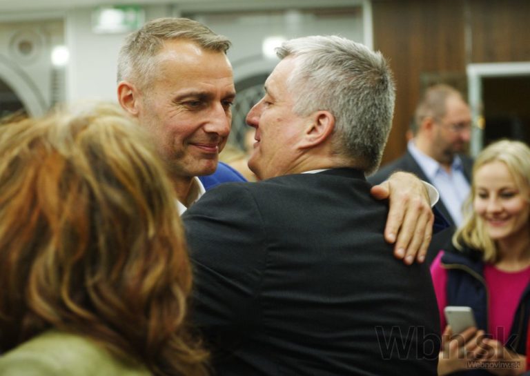 Víťaz volieb na post primátora Košíc Richard Raši (vľavo) oslavuje počas komunálnych volieb 2014. Košice, 15. november 2014. Foto: SITA/Tibor Zmak